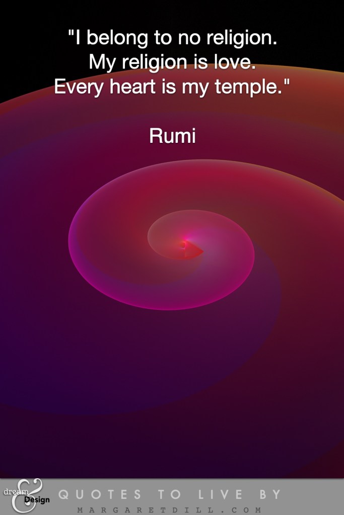 January 19, 2020January 31, 2022 margaretdill I Belong to No Religion I belong to no religion. My religion is love. Every heart is my temple. Rumi Love Peace & Understanding Share this: Click to share on Pinterest (Opens in new window) Pinterest Click to share on Tumblr (Opens in new window) Tumblr Click to share on X (Opens in new window) X Click to share on Facebook (Opens in new window) Facebook Click to share on LinkedIn (Opens in new window) LinkedIn Like Loading... Related