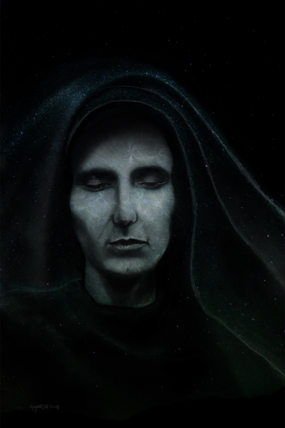 Saint Mary An ethereal dreamlike spiritual portrait in deep blues and shadow, is part of my spiritual beings of light collection. Artwork by Margaret Dill #Visionaryart #Visionaryartspiritual #Visionaryartmystical #Margaretdill